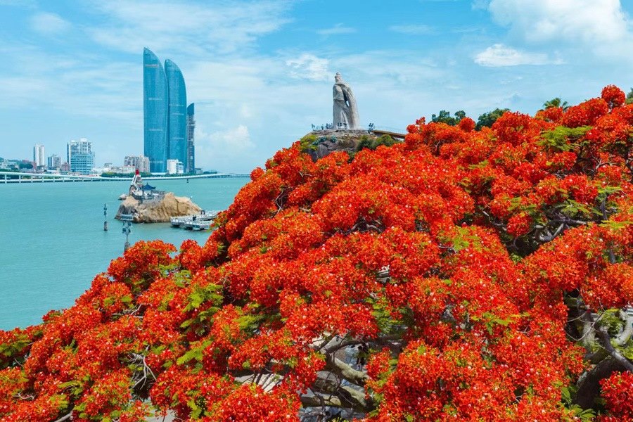 廈門鼓浪嶼上鳳凰花盛開(kāi),灼熱的陽(yáng)光灑向鳳凰木枝頭,光影斑駁,滿眼盡是艷麗的橙紅色,映照出夏日的動(dòng)人景致。