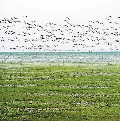順著他手指的方向,只見大大小小的灘涂上,有黑點和白點在移動。通過望遠鏡一看,竟是一群群水鳥。水草在清澈的湖中搖曳,有的已經高出了水面。