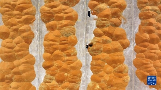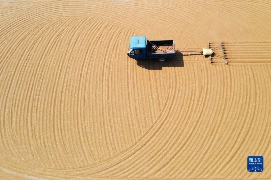 6月9日,在江蘇省如皋市糧食儲(chǔ)備有限公司曬糧場(chǎng)上,工作人員用機(jī)械翻曬入庫(kù)的小麥(無(wú)人機(jī)照片)。