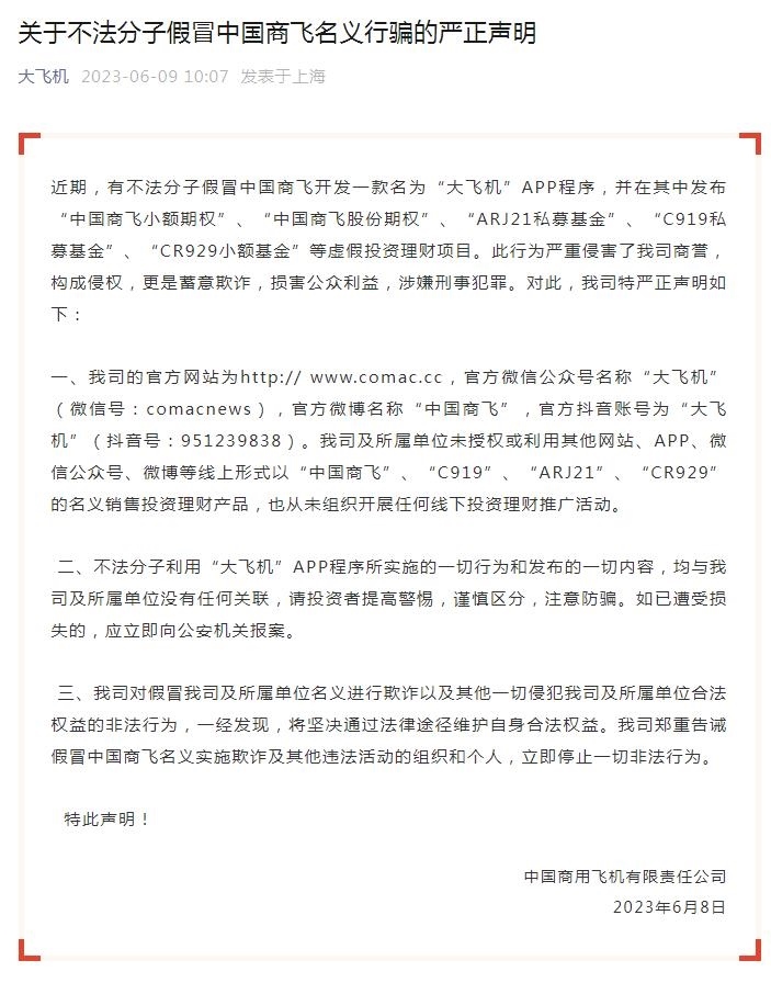 另據(jù)“大飛機(jī)”微信公眾號6月9日發(fā)布的《關(guān)于不法分子假冒中國商飛名義行騙的嚴(yán)正聲明》,有不法分子假冒中國商飛開發(fā)一款名為“大飛機(jī)”APP程序,并在其中發(fā)布“中國商飛小額期權(quán)”、“中國商飛股份期權(quán)”、“ARJ21私募基金”、“C919私募基金”、“CR929小額基金”等虛假投資理財(cái)項(xiàng)目。