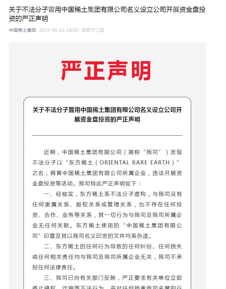 “中國稀土集團(tuán)”微信公眾號曾在6月1日發(fā)布嚴(yán)正聲明提醒,近期,中國稀土集團(tuán)有限公司(下稱“中國稀土”)發(fā)現(xiàn)不法分子以“東方稀土(ORIENTAL RARE EARTH)”之名,假冒中國稀土集團(tuán)有限公司所屬企業(yè),違法開展資金盤投資等活動(dòng)。
