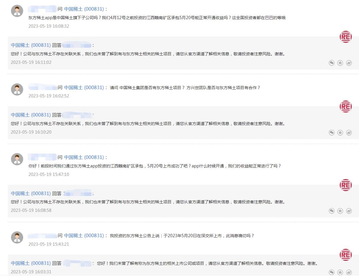 中新財(cái)經(jīng)注意到,有投資者曾在互動(dòng)平臺(tái)上向中國稀土詢問“東方稀土”相關(guān)信息,從提問內(nèi)容看,可能已有投資者被誤導(dǎo)受騙。比如,“東方稀土APP是中國稀土旗下子公司嗎?我們4月12號之前投資的江西贛南礦區(qū)承包5月20號能正常開通收益嗎?”“我投資的東方稀土公告上說:于2023年5月20曰在深交所上市,此消息確切嗎?”等等。