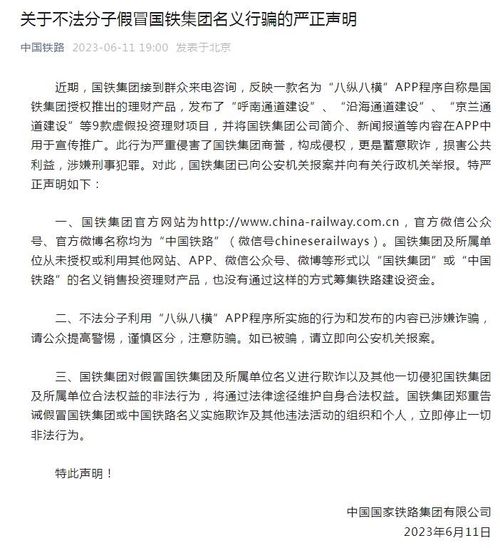 “中國鐵路”微信公眾號6月11日發(fā)布嚴(yán)正聲明稱,近期,國鐵集團(tuán)接到群眾來電咨詢,反映一款名為“八縱八橫”APP程序自稱是國鐵集團(tuán)授權(quán)推出的理財(cái)產(chǎn)品,發(fā)布了“呼南通道建設(shè)”、“沿海通道建設(shè)”、“京蘭通道建設(shè)”等9款虛假投資理財(cái)項(xiàng)目,并將國鐵集團(tuán)公司簡介、新聞報(bào)道等內(nèi)容在APP中用于宣傳推廣。