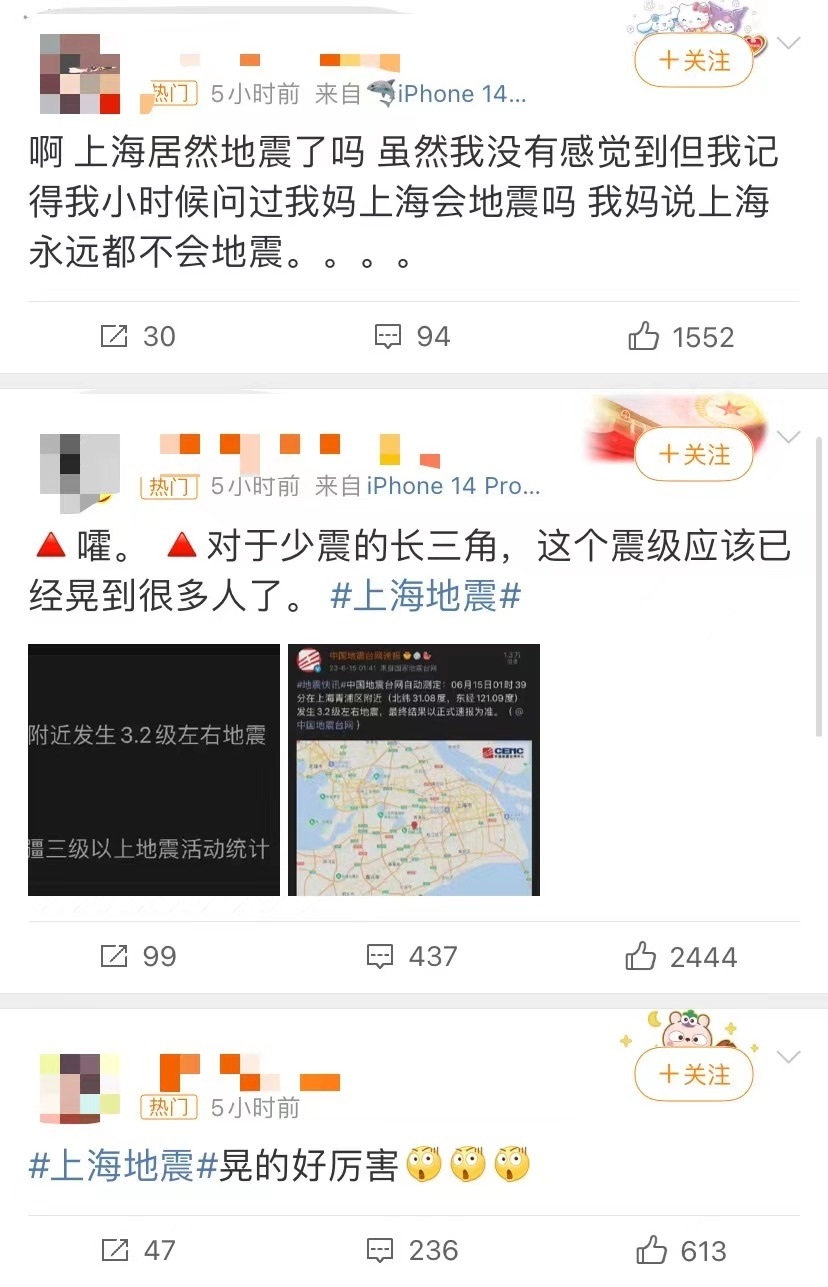 有網(wǎng)友表示,“床明顯在晃動”“持續(xù)了四五秒”“徐匯輕微有震感”,不過也有很多網(wǎng)友表示,“在睡夢中完全沒有感覺到”。
