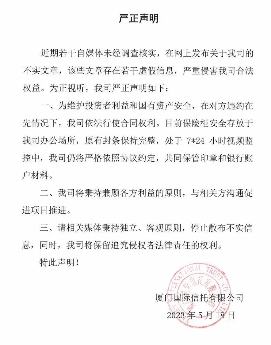 5月18日,廈門信托在官網(wǎng)和官方微信公眾號發(fā)布嚴正聲明稱,為維護投資者利益和國有資產(chǎn)安全,在對方違約在先情況下,我司依法行使合同權(quán)利。目前保險柜安全存放于我司辦公場所,原有封條保持完整,處于7*24小時視頻監(jiān)控中,我司仍將嚴格依照協(xié)議約定,共同保管印章和銀行賬戶材料。此外,我司將秉持兼顧各方利益的原則,與相關(guān)方溝通促進項目推進。