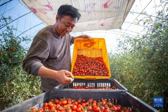 在吳忠市同心縣下馬關(guān)鎮(zhèn)的小番茄溫棚內(nèi),農(nóng)民在分揀小番茄(9月14日攝)。
