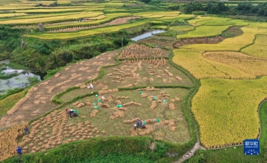 金秋時節(jié),各地農(nóng)民搶抓晴好天氣忙收獲,田間地頭一派繁忙景象。新華社發(fā)(袁福洪 攝)