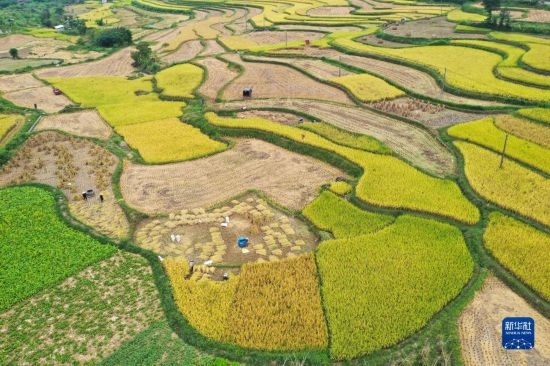 9月14日,重慶市酉陽土家族苗族自治縣楠木鄉(xiāng)紅莊村村民在高山稻田里收割水稻。