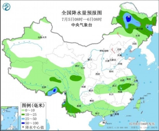 7月5日08時(shí)至6日08時(shí),內(nèi)蒙古東北部、黑龍江、吉林北部以及江西北部、安徽南部、川西高原北部、云南西部和南部、西藏東南部等地部分地區(qū)有中到大雨,其中,內(nèi)蒙古東北部、西藏東南部等地部分地區(qū)有暴雨(50~65毫米)。內(nèi)蒙古中東部、華北北部和東部、山東半島、東北地區(qū)北部和南部等地部分地區(qū)有4~6級(jí)風(fēng)。
