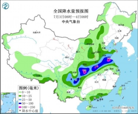 中央氣象臺(tái)7月3日06時(shí)繼續(xù)發(fā)布暴雨藍(lán)色預(yù)警:預(yù)計(jì),7月3日08時(shí)至4日08時(shí),山東中南部、江蘇北部、安徽北部、河南東部和南部、湖北北部和西部、陜西南部、重慶、四川東部、貴州西北部、云南東北部以及廣東西南部沿海等地部分地區(qū)有大到暴雨,其中,山東南部、江蘇北部、河南南部、重慶北部、四川東北部等地局地有大暴雨(100~160毫米)。上述部分地區(qū)伴有短時(shí)強(qiáng)降水(最大小時(shí)降雨量30~50毫米,局地可超過60毫米),局地有雷暴大風(fēng)等強(qiáng)對(duì)流天氣。