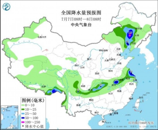 7月6日08時(shí)至7日08時(shí),內(nèi)蒙古東北部、黑龍江南部、西藏東南部和北部、青海南部、川西高原中北部、云南西部和南部、重慶大部、湖北西部和東北部、河南南部、安徽中北部、江蘇大部等地部分地區(qū)有中到大雨,其中,蘇皖中部等地部分地區(qū)有暴雨,局地大暴雨(100~140毫米);內(nèi)蒙古中東部等地有4~6級(jí)風(fēng)。