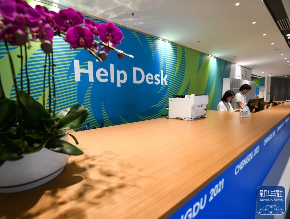 ↑7月13日,在成都大運(yùn)會(huì)主媒體中心,工作人員正在服務(wù)臺(tái)工作。新華社記者 王曦 攝
