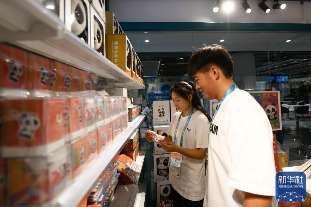 ↑7月14日,媒體工作人員在成都大運(yùn)會(huì)主媒體中心大運(yùn)會(huì)官方特許商品零售店內(nèi)選購紀(jì)念品。新華社記者 胥冰潔 攝