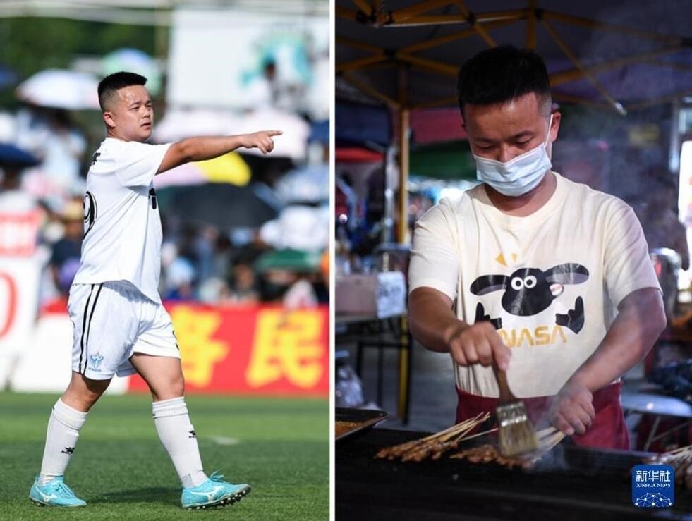 貴州“村超”球員的“雙面人生”。左圖為7月15日,六佰塘村足球隊(duì)球員楊宗維在比賽中組織進(jìn)攻;右圖為7月16日,楊宗維在燒烤攤給客人烤肉串。