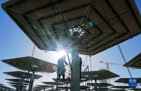7月21日,在阿克塞千萬千瓦級可再生能源多能互補(bǔ)基地,工人在匯東新能源75萬千瓦光熱+項目建設(shè)現(xiàn)場施工。新華社發(fā)(馬曉偉 攝)