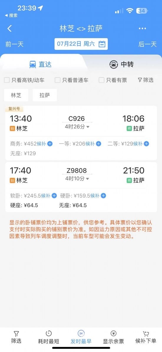 通過在鐵路售票APP上查詢發(fā)現(xiàn),從林芝開往拉薩的復(fù)興號(hào)城際列車的二等座票價(jià)為129元,直達(dá)特快列車硬座為64.5元?!跋啾容^原先180元的客運(yùn)汽車票價(jià),直達(dá)特快列車便宜了近乎三分之一。”曹先生感慨地說道。