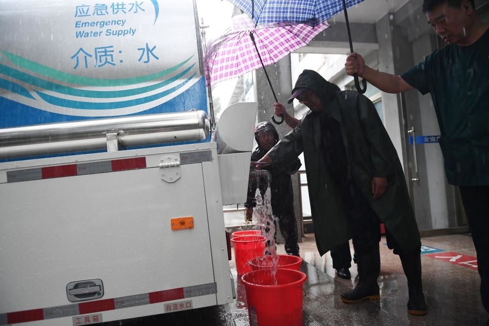 7月31日傍晚,門頭溝區(qū)上岸療養(yǎng)院工作人員在應(yīng)急供水車處取水。新華社記者 鞠煥宗 攝