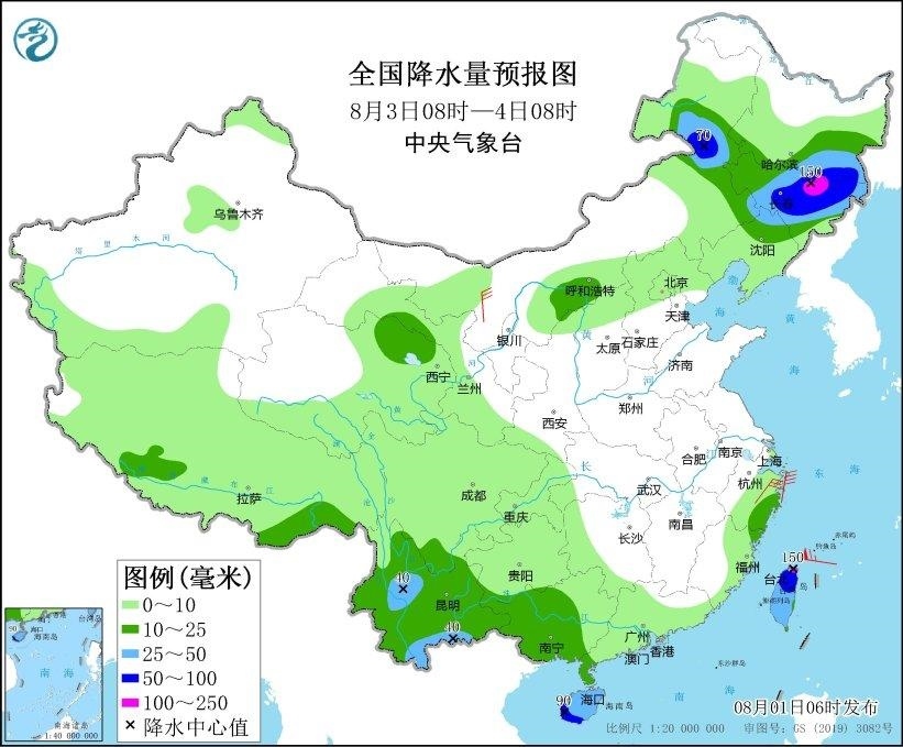 8月2日08時至3日08時,內(nèi)蒙古東部、黑龍江南部、吉林大部、青海北部、四川東部、貴州、云南、廣西西部、海南島、臺灣島等地部分地區(qū)有中到大雨,其中,黑龍江東南部、吉林中東部、海南島西南部等地局地有暴雨或大暴雨(100~150毫米)。遼寧中部、浙江北部等地部分地區(qū)有4~5級風(fēng)(見圖2)。