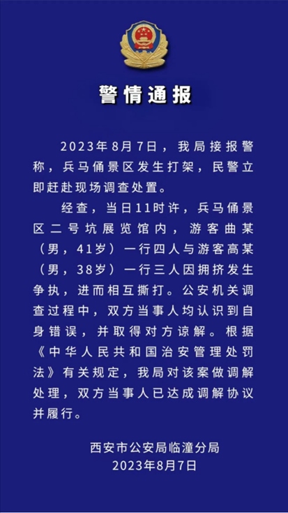 ·西安警方通報兵馬俑景區(qū)打架事件:雙方當事人已達成調(diào)解協(xié)議。