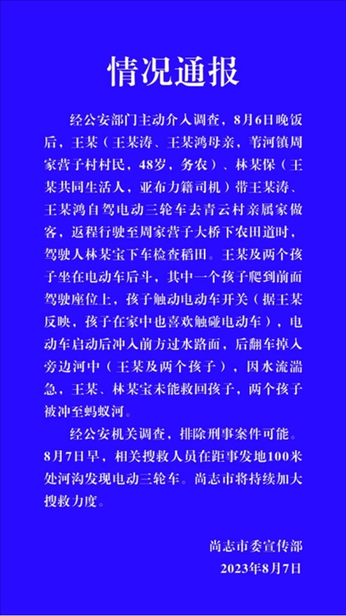 ·黑龍江尚志通報兩孩子墜河:誤觸電動車開關(guān),排除刑案可能。