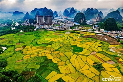 廣西柳州融水苗族自治縣融水鎮(zhèn)西廓村連片種植的水稻由青轉(zhuǎn)黃,豐收在望,田園與大山、村莊交相輝映,構(gòu)成一幅美麗的喀斯特地貌田園畫卷。