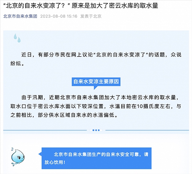 央視網(wǎng)消息:近日,有部分市民在網(wǎng)上議論“北京的自來水變涼了”的話題。北京市自來水集團(tuán)8月8日通過其公眾號(hào)回應(yīng),由于汛期,近期北京市自來水集團(tuán)加大了本地密云水庫的取水量,取水口位于密云水庫水面以下較深位置,水溫目前在10攝氏度左右,與之前相比,部分供水區(qū)域自來水的水溫偏低。