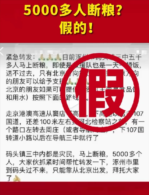 近日,網傳“河北省涿州市碼頭鎮(zhèn)5000多人將斷糧,救援隊也是一天只吃一頓飯,送不過去”消息,引發(fā)了眾多網民關注。