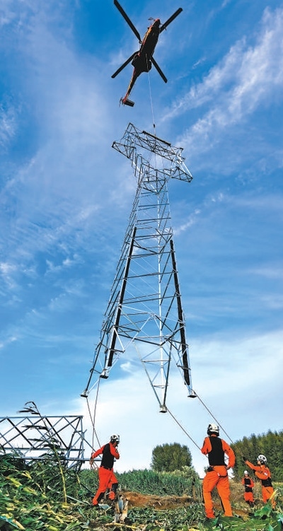 8月9日,國家電網(wǎng)公司調(diào)配直升機(jī)支援黑龍江電力恢復(fù)工作。圖為直升機(jī)在牡丹江海林110千伏海長線搶修現(xiàn)場整塔吊裝作業(yè)中。方 圓 張恩全攝影報道