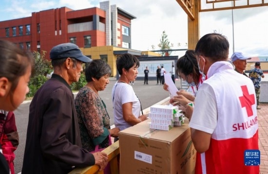 8月11日,居民在吉林省舒蘭市舒蘭三中居民安置點(diǎn)領(lǐng)取舒蘭市紅十字會(huì)發(fā)放的藥品物資。