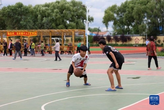 8月11日,居民在吉林省舒蘭市舒蘭三中居民安置點(diǎn)打籃球。