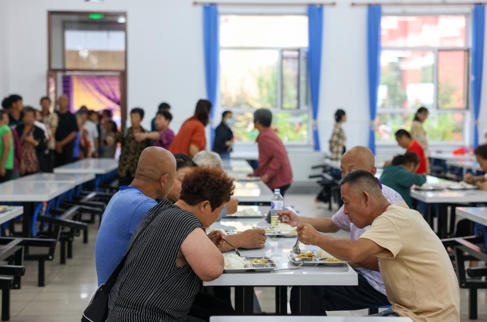 8月11日,村民在舒蘭三中安置點食堂里吃飯。新華社記者顏麟蘊 攝