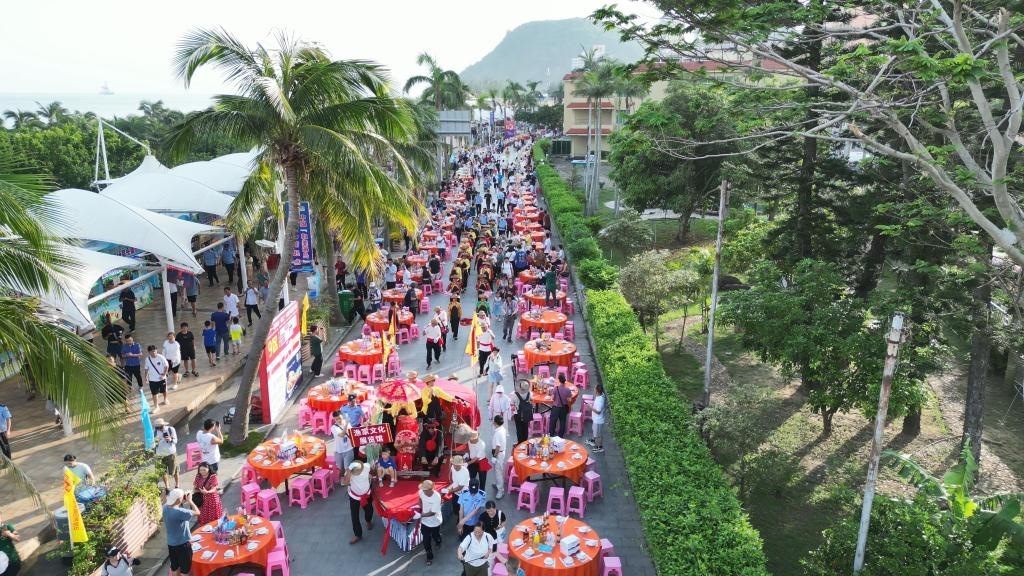 上千桌宴席沿街?jǐn)[開,來自五湖四海的游客和當(dāng)?shù)貪O民們歡聚一堂,沐浴著星光與海風(fēng),從五柳紅古魚,到海膽海鮮飯,一道道漁家美食端上餐桌,讓食客品嘗舌尖美味,感受來自海陵島的獨特風(fēng)味。