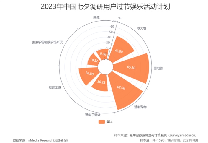 今年七夕恰逢工作日,大多數(shù)人選擇下班后再相聚。“中國七夕節(jié)日消費行為大數(shù)據(jù)調查”顯示,2023年消費者過節(jié)的娛樂活動計劃TOP3分別為:逛街購物、看電影、吃大餐。