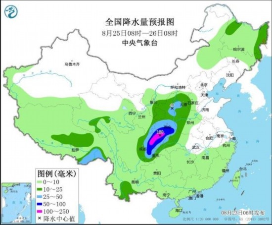 8月25日08時(shí)至26日08時(shí),內(nèi)蒙古河套地區(qū)、黑龍江東部、吉林東部、甘肅東部、寧夏、四川中東部、重慶、河南西部、湖北西部、貴州北部、云南南部、廣東南部以及西藏東部、青海南部等地的部分地區(qū)有中到大雨,其中,陜西南部、四川東北部、重慶西部和北部等地的部分地區(qū)有暴雨或大暴雨(100~180毫米)。遼東半島、山東半島等地的部分地區(qū)有4~5級(jí)風(fēng)。