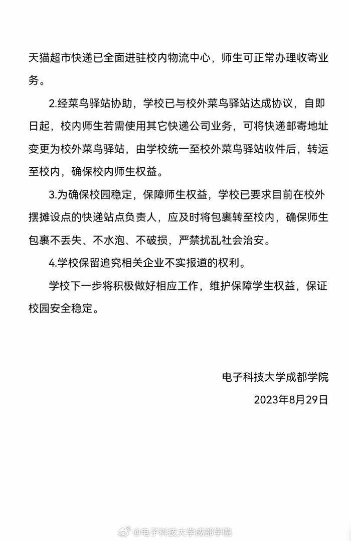 央視網(wǎng)消息:@電子科技大學(xué)成都學(xué)院 微博8月29日就網(wǎng)傳“成都一高校拒絕快遞進(jìn)?!卑l(fā)布情況說明。其中表示,目前,中國郵政、京東快遞、順豐快遞三家快遞企業(yè)以及天貓超市快遞已全面進(jìn)駐校內(nèi)物流中心。