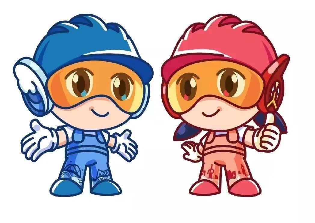 本屆大賽的吉祥物為“天天、津津”,形象為“一男、一女”兩個青年人物的造型,具有青春、活力、向上的鮮明特點,色彩以藍(lán)色、紅色為主色調(diào),突出“技能藍(lán)、青春紅”,與大賽會標(biāo)“技”字標(biāo)識相呼應(yīng);服飾上通過統(tǒng)一的工裝服、安全帽、護(hù)目鏡、藍(lán)牙耳機(jī)等外形設(shè)計,形象鮮明地展現(xiàn)新時代技能人才的外表特征;通過人物專注自信的表情和張開雙臂、舉手點贊等形態(tài),凸顯了技能人才“力爭上游、奮勇拼搏”的精神面貌和天津人民“自信包容、樂觀好客”的性格特質(zhì)。同時,通過摩天輪造型耳機(jī)、特色橋梁、港口、天津新老標(biāo)志性建筑等形象設(shè)計,展現(xiàn)天津的城市元素。