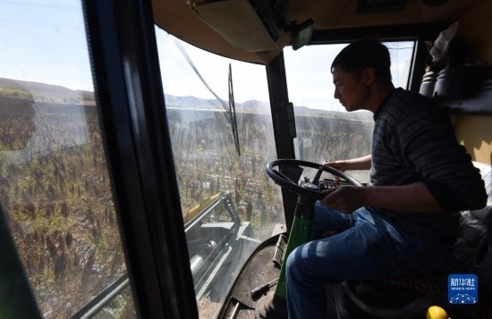 10月1日,在沽源縣白土窯鄉(xiāng)小西溝村,當(dāng)?shù)剞r(nóng)機手王永成在操作收割機收獲藜麥。