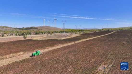 10月1日,在沽源縣白土窯鄉(xiāng)小西溝村,當(dāng)?shù)剞r(nóng)機手在操作收割機收獲藜麥。