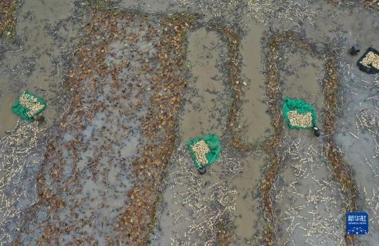 10月5日,河北省新河縣西流鄉(xiāng)西董村一家蓮藕種植合作社的社員在收獲蓮藕(無(wú)人機(jī)照片)。