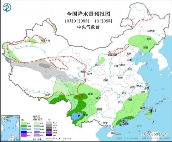圖1 全國降水量預(yù)報圖(10月8日08時-9日08時)
