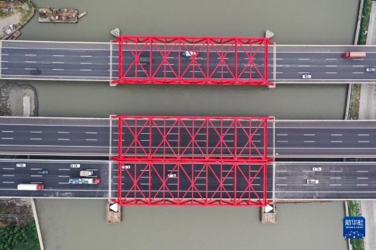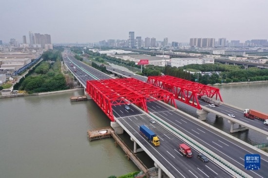 10月10日,車輛通過滬寧高速公路青陽港大橋(無人機照片)。