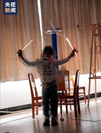 實(shí)驗(yàn)展示過(guò)程中,屈老師手持熒光燈管,逐漸靠近特斯拉線圈,轉(zhuǎn)瞬之間,一道電流好像穿過(guò)他的身體,形成絢麗的火花,現(xiàn)場(chǎng)畫(huà)面仿佛置身科幻電影。