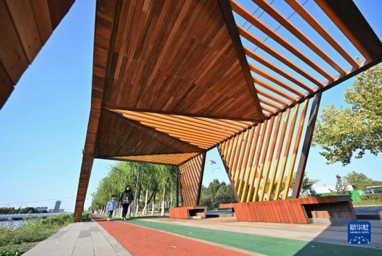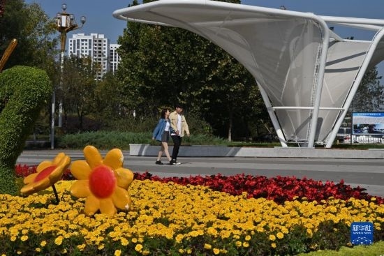 10月15日,市民從唐山市海港經濟開發(fā)區(qū)城市休閑驛站走過。