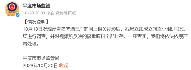 《每日經(jīng)濟新聞》記者注意到,青島啤酒三廠所在地的平度市市場監(jiān)管局也發(fā)布情況說明稱,10月19日發(fā)現(xiàn)涉青島啤酒三廠的網(wǎng)上相關視頻后,我局立即成立調(diào)查小組進駐現(xiàn)場進行調(diào)查,并對視頻所反映的該批原料全部封存?!耙唤?jīng)查實,我們將依法依規(guī)嚴肅處理?!?/p>