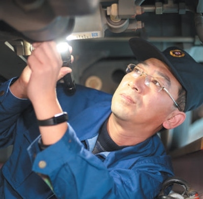 時而膝蓋微弓,腰部略彎;時而敲敲打打,上前細(xì)嗅……只見劉波進車廂、鉆車底、登車頂,對列車逐一進行檢查,不一會兒,動車隱患就被及時發(fā)現(xiàn)并排除。
