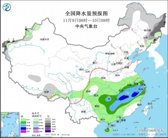 11月9日08時至10日08時,新疆西部、內(nèi)蒙古東北部、黑龍江大部、吉林中東部、遼寧東北部等地部分地區(qū)有小到中雪或雨夾雪,其中,黑龍江東部、吉林東部、新疆南疆西部山區(qū)等地部分地區(qū)有大雪,局地暴雪。重慶東南部、貴州東部、湖北東部、湖南大部、蘇皖南部、上海、江西中北部、浙江大部、福建西北部以及廣西東北部等地部分地區(qū)有中到大雨,其中,江西西部和東北部、浙江西南部、福建西北部等地部分地區(qū)有暴雨(50~80毫米)。內(nèi)蒙古中東部、遼寧大部、華北東部和北部、黃淮北部、江南東部等地部分地區(qū)有4~6級風(見圖3)。