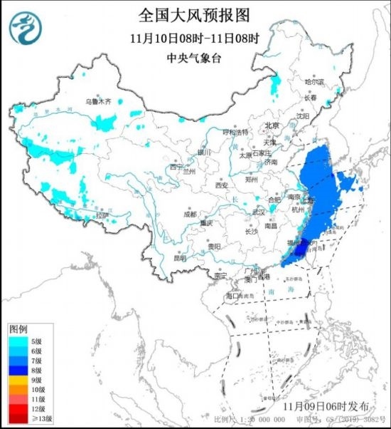 11月10日08時至11日08時,黃海中部和南部海域、東海大部海域、臺灣海峽、南海東北部偏北海域?qū)⒂?~8級、陣風9~10級的大風。新疆東部和南部、西藏南部和西北部、內(nèi)蒙古東部、東南沿海將有5~6級、陣風7~8級的大風。中央氣象臺11月9日06時發(fā)布大風藍色預警(見圖1、2)。