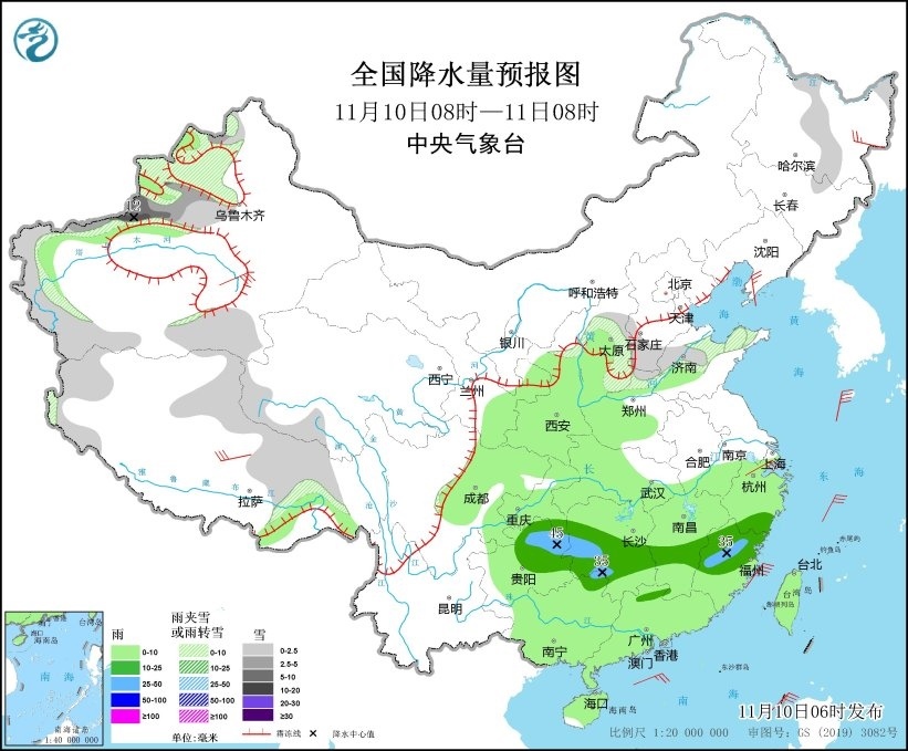11月10日08時(shí)至11日08時(shí),新疆西部和南疆南部、西藏西部和北部、青海南部、黑龍江東部、吉林北部、山西北部、河北南部、山東西部等地部分地區(qū)有小到中雪或雨夾雪,其中,新疆伊犁河谷和沿天山一帶等地部分地區(qū)有大雪,局地暴雪(10~12毫米)。重慶東南部、貴州東部和北部、湖南中南部、江西中南部、浙江南部、福建中北部以及廣西東北部等地部分地區(qū)有中雨,其中,貴州東北部、湖南西部、福建西北部等地部分地區(qū)有大雨(25~45毫米)。黑龍江東北部、遼東半島、新疆南疆盆地、西藏北部、浙江北部等地部分地區(qū)有4~6級(jí)風(fēng)(見圖4)。