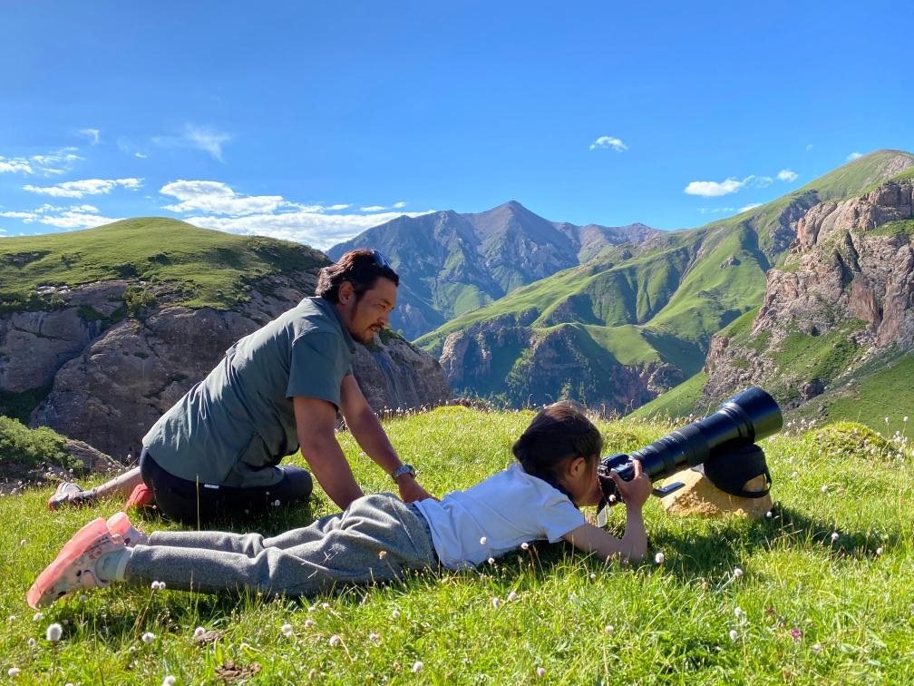 2020年7月,達(dá)杰在指導(dǎo)女兒拍攝雪豹。(受訪對(duì)象供圖)