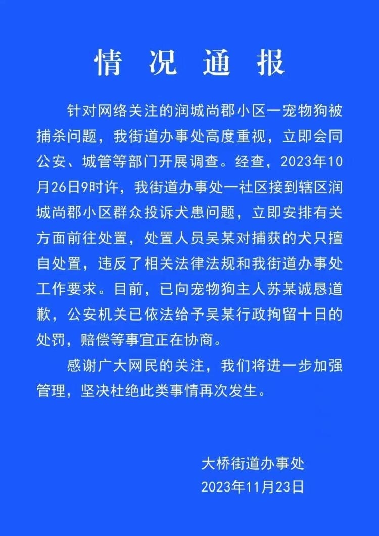 ·安徽安慶通報“寵物犬被捕狗隊抓走后送往市場宰殺”:處置人員被行拘10日。